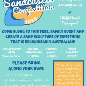 The Great Aussie Sandcastle Competetion Held annually on Australia Day at Bluff Beach Devonport, The Great Aussie Sandcastle Competition is back once again and ready... 26 Jan 10:00 am Bluff Beach Devonport