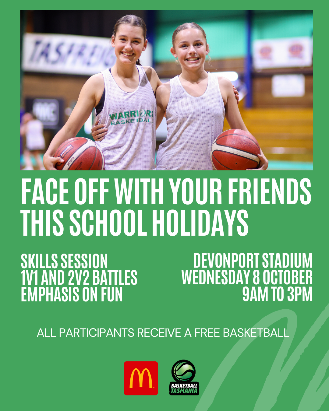Basketball Tasmania and McDonald’s present this unique holiday camp, which flips the script — bring your friend along and team up in 2v2 games, then go head-to-head in 1v1 battles for bragging rights.