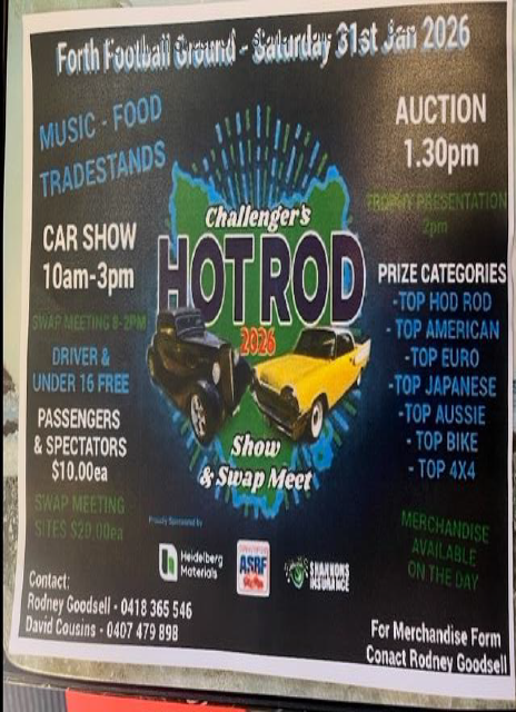 Challengers Custom Hot Rod and Swap Meet Car Show is on again at the Forth Football Ground on Saturday January 31, 2026. Food and drinks available on the day, prizes for Top cars in different categories, Entry is free if you show your car, passengers and spectators are $ 10.00 each entry, children under 16 free.