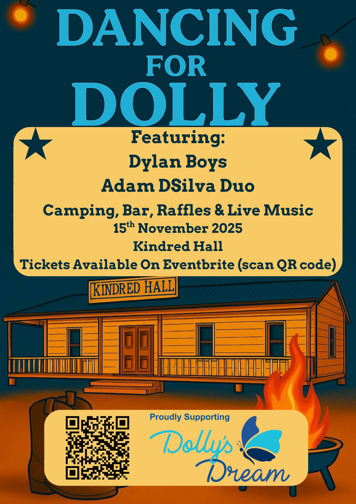 Brush off your hat, pull on your boots, and get ready for a night of music, mateship, and memories—Dancing for Dolly is lighting up Kindred Hall for the very first time!
