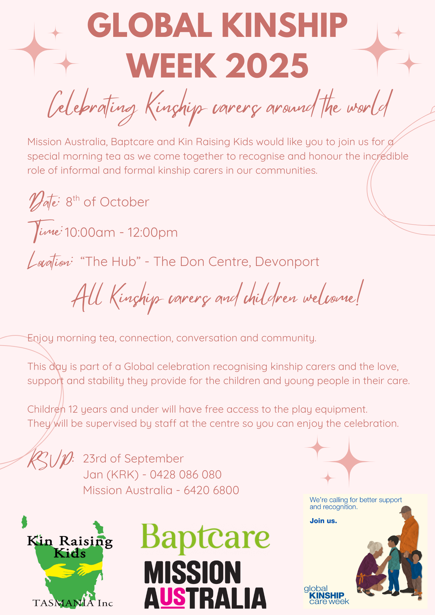 Mission Australia, Baptcare, and Kin Raising Kids will be celebrating the Global Kinship week around the state of Tasmania and in the North West, we cordially invite you to join us for a special morning tea in recognition of the extraordinary contributions of both informal and formal kinship carers within our communities.