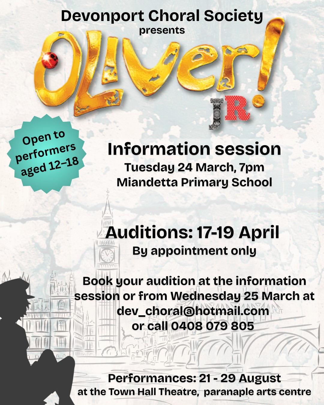The Devonport Choral Society is thrilled to announce auditions for their 2026 youth production of Oliver! Jr, with an information session being held on Thursday the 24th of March at 7pm at Miandetta Primary School.