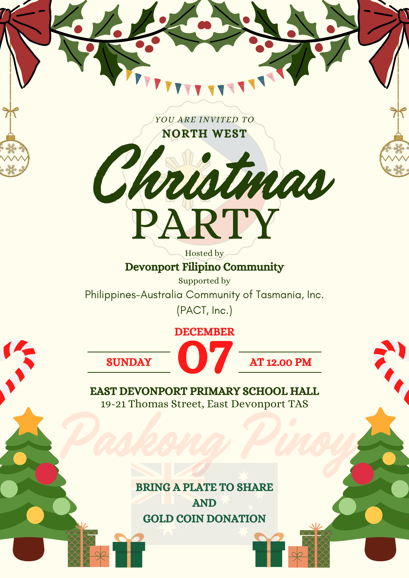 Northwest Filipino Community, let’s come together for a joyful celebration of Filipino Christmas in Devonport. Proudly supported by Philippines-Australia Community of Tasmania Inc. (PACT Inc.)